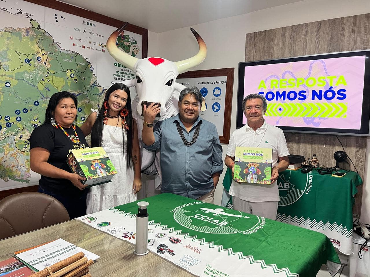 O Boi-Bumbá Garantido visitou, na terça-feira (02), a sede da Coordenação das Organizações Indígenas da Amazônia Brasileira (Coiab), em Manaus, para acompanhar a apresentação da campanha “A Resposta Somos Nós!”. A iniciativa reforça a mobilização e conscientização das urgências climáticas e ambientais da Amazônia e do mundo, destacando o enfrentamento ao desmatamento e as lutas por demarcação e proteção de territórios indígenas e quilombolas como políticas essenciais de mitigação da crise climática, pautas historicamente levadas à arena pelo Boi do Povão.