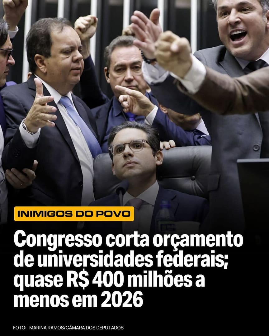 As universidades federais terão quase R$ 400 milhões a menos em recursos discricionários em 2026, após cortes feitos pelo Congresso Nacional no Projeto de Lei Orçamentária Anual. Segundo a Associação Nacional dos Dirigentes das Instituições Federais de Ensino Superior (Andifes), o orçamento cairá de R$ 6,82 bilhões executados em 2025 para cerca de R$ 6,43 bilhões em 2026, já desconsiderando os efeitos da inflação, o que compromete despesas básicas como água, luz, manutenção, segurança, limpeza e bolsas estudantis.