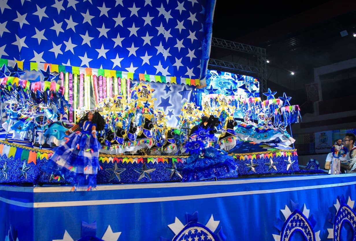 O Mini Garantido abriu a noite de apresentações e levou à arena um espetáculo que surpreendeu pela grandiosidade. Com o tema “Marcas Vivas”, o boizinho da baixa do São José mostrou a força dos povos originários, lenda amazônica, rituais e a homenagem a mestres da cultura parintinense. A apresentação emocionou o público pela grandiosidade artística e envolvimento das crianças que apresentaram o mini bumbá.