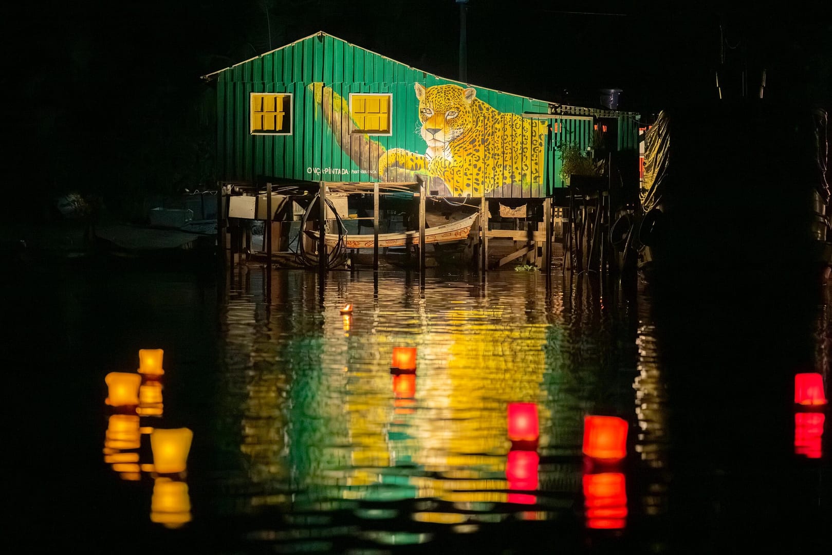 Foram 38 palafitas pintadas por artistas de diversas regiões do Brasil, exibindo em suas fachadas animais ameaçados de extinção, símbolos da força e da fragilidade da floresta. Com o cair da noite, cada casa foi iluminada cuidadosamente, criando uma constelação terrestre refletida nas águas do rio.