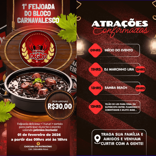 O presidente Jailson Rodrigues Assis reforça o convite para que o público leve familiares e amigos para aproveitar um dia de lazer, boa comida e entretenimento. A 1ª Feijoada do Bloco Carnavalesco Rubro-Negro marca o início das atividades carnavalescas do grupo.